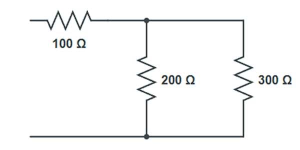 Situação: R1 = 100 Ω está em série com a associação em paralelo de R2 = 200 Ω e R3 = 300 Ω. Qual a resistência equivalente total?