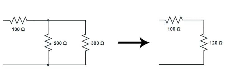 Enunciado: R1 = 100 Ω e R2 = 200 Ω estão em paralelo. O resultado está em série com R3 = 150 Ω. Todo esse conjunto está em paralelo com R4 = 300 Ω. Qual a resistência equivalente?