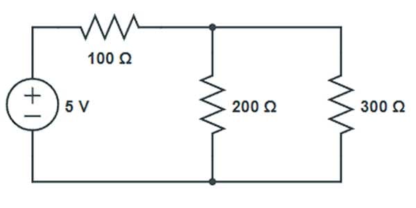 Enunciado: R1 = 100 Ω e R2 = 300 Ω estão em paralelo, ligados a uma fonte de 6 V. Qual a corrente em cada ramo e a corrente total?