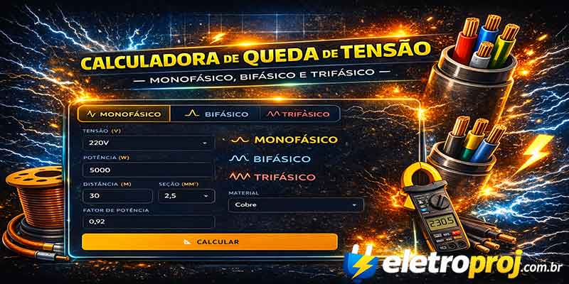 Calculadora de Queda de Tensão — Monofásico, Bifásico e Trifásico
