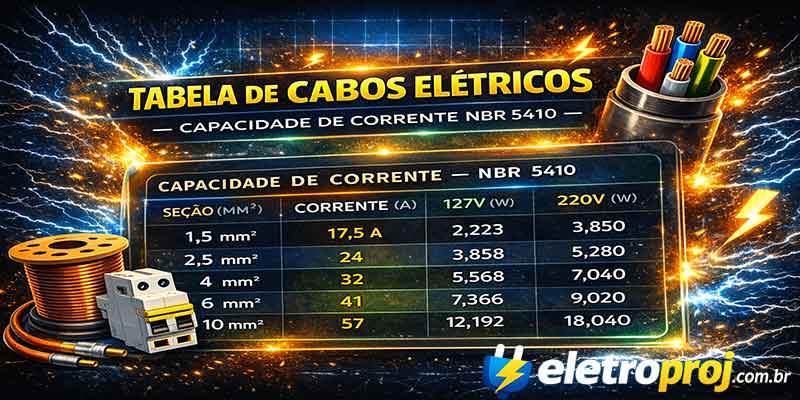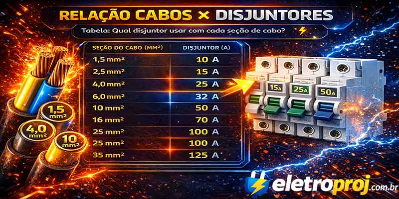 A tabela de disjuntores e cabos é uma referência rápida que relaciona cada corrente nominal de disjuntor com a bitola mínima do cabo necessário para proteção contra sobrecarga.