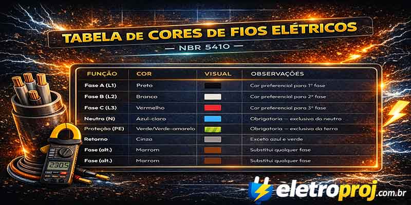 A tabela de cores apresenta a identificação obrigatória dos condutores em instalações elétricas de baixa tensão, conforme definido pela NBR 5410.