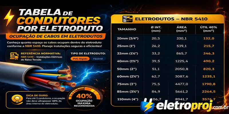A calculadora de eletrodutos determina o tamanho mínimo do eletroduto necessário para acomodar uma determinada quantidade de cabos, respeitando a taxa máxima de ocupação da NBR 5410.