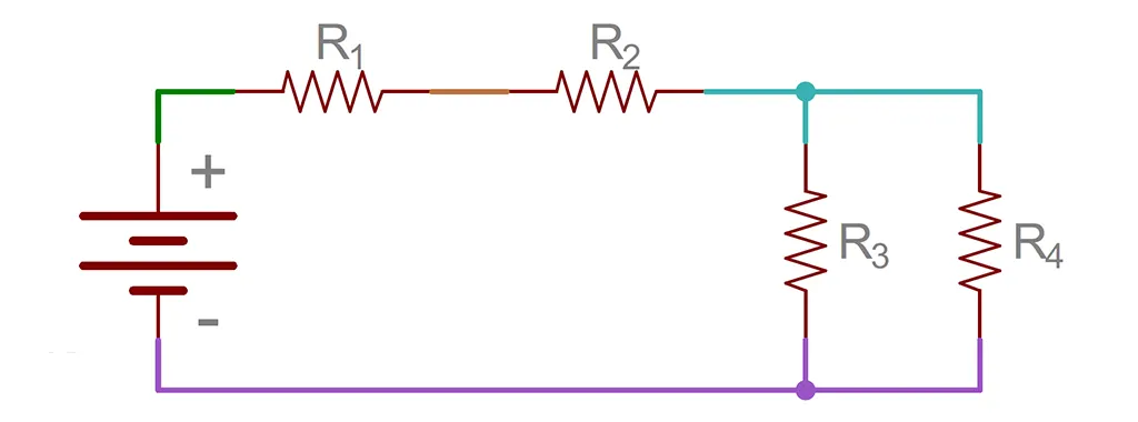 Na imagem acima, os resistores R1 e R2 estão em série, já os resisotres R3 e R4 estão em paralelo e o circuito composto por resistores em série e paralelo é denominado circuito misto, como no exemplo acima.