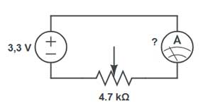 Problema: Um potenciômetro de 4,7kΩ está ligado com 3,3V entre os terminais extremos. Qual é a corrente total que passa pela trilha resistiva?