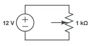 Aplicando a Lei de Ohm: se a fonte é 5V e o potenciômetro é de 1kΩ, a corrente máxima será