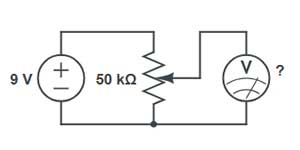 Problema: Um potenciômetro linear (B) de 50kΩ está ligado como divisor de tensão com 9V. O cursor está a 40% do curso partindo do terminal ligado ao positivo. Qual tensão no terminal central?