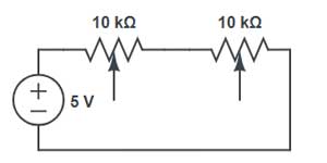 Problema: Dois potenciômetros de 10kΩ estão ligados em série (terminal 3 do primeiro no terminal 1 do segundo), com 5V no terminal 1 do primeiro e GND no terminal 3 do segundo. Ambos estão no meio do curso. Qual a resistência total e a corrente?