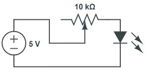 Problema: Um potenciômetro de 1kΩ é usado como reostato (apenas dois terminais: central e um extremo). Está ligado em série com um LED (queda de 2V, corrente desejada de 15mA) e uma fonte de 5V. Em qual posição o cursor deve estar?