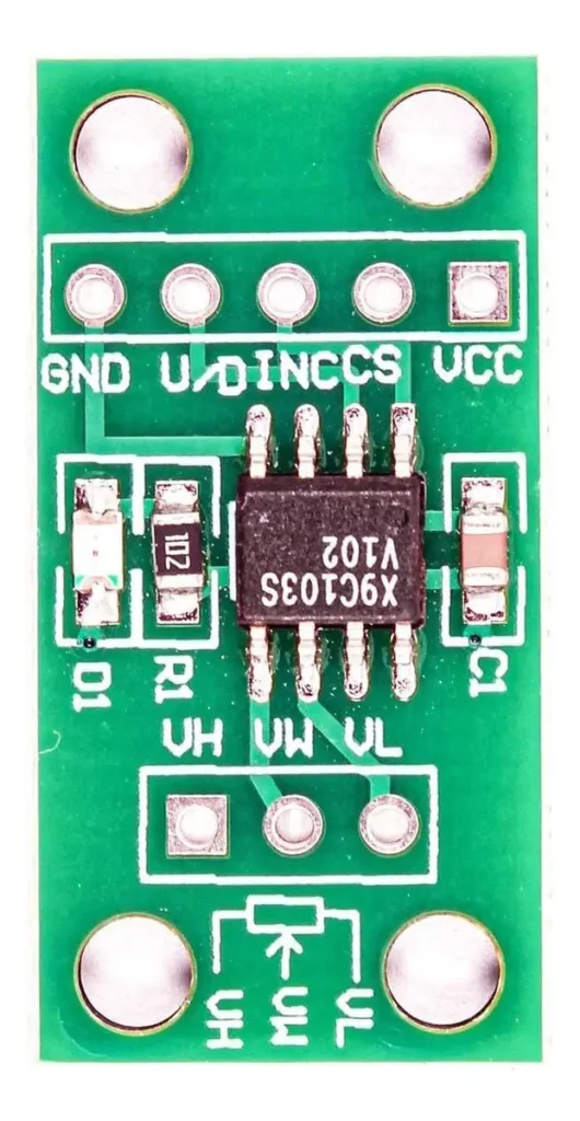 O potenciômetro digital não tem partes mecânicas. Ele usa um circuito integrado (CI) com uma rede de resistores internos que simulam as posições de um potenciômetro analógico. O ajuste é feito via comandos digitais (SPI, I²C ou sinais de incremento/decremento).