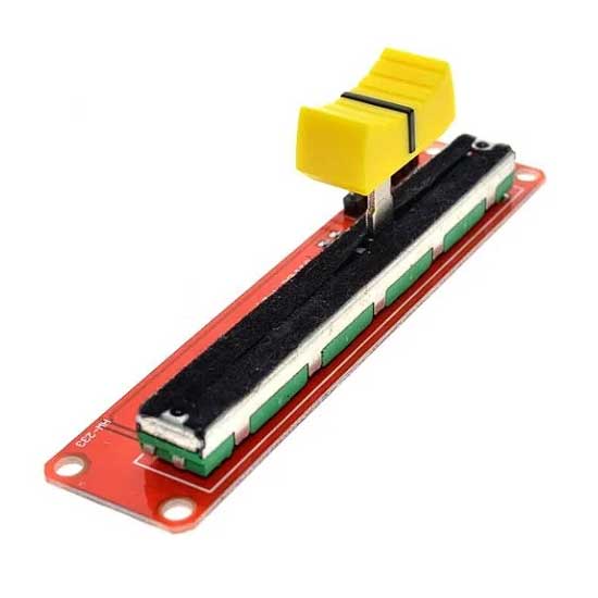 Em vez de girar, o controle desliza em linha reta. É o tipo que você vê em mesas de som, equalizadores e mixers de áudio. O funcionamento é o mesmo do rotativo, só muda a mecânica.