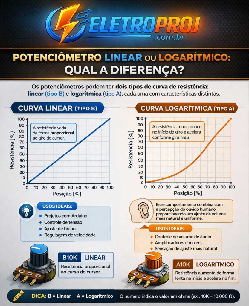Dica prática: se o potenciômetro tem a letra “B” impressa (ex: B10K), é linear. Se tem “A” (ex: A10K), é logarítmico. Essa convenção vale para a maioria dos fabricantes (o padrão japonês inverte, mas é menos comum no Brasil).
