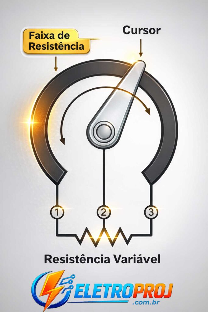 Pense na trilha resistiva como uma estrada. O cursor é um ponto nessa estrada. A distância do cursor até cada extremidade da estrada determina a resistência que o circuito “enxerga” em cada lado.